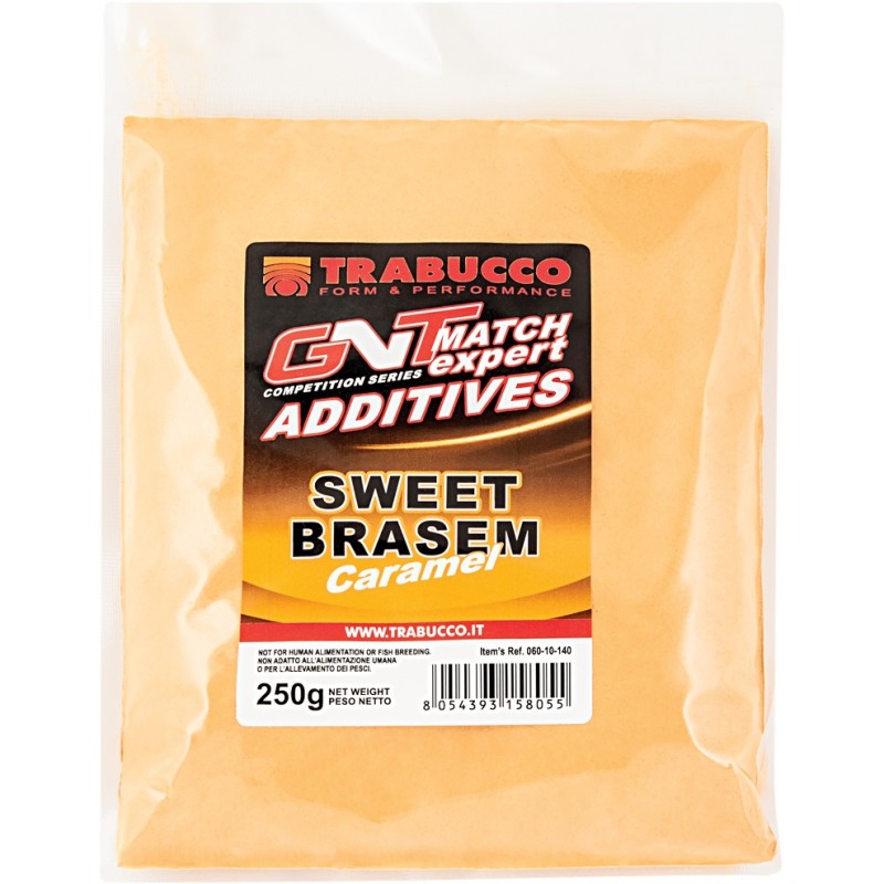 Aditiv Trabucco Additives GNT Sweet Brasem Caramel 250gAceste pulberi alimentare cu un caracter puternic aromat, sunt compatibile cu orice nada fara a le afecta proprietatile nutritionale in amestec. Au numai un rol de activare a atractiei. Amestecul optimal este un dozaj de 50gr pentru 1kg. Procesul ideal de mixare incepe cu, componentele uscate care se amesteca, iar numai dupa aceasta incepem sa adaugam lichidul de amestec.Cantitate : 250g/plic