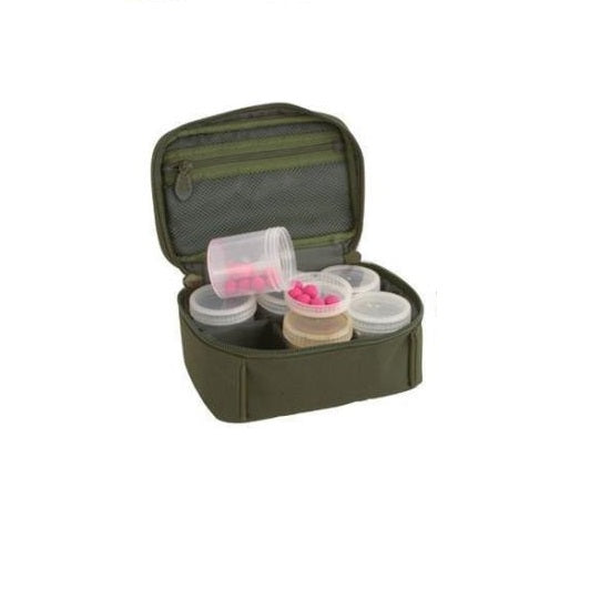 Geanta Fox Royale Dip Bag. Caracteristici:  Proiectata pentru depozitarea si transportul momelilor, dipurilor si a altor lichide.  Maner rigidizat cu EVA în partea de sus.  Buzunar din plasa cu fermoar în capac pentru depozitarea crosetelor, uneltelor, a stopperelor etc.  Livrata cu sase borcane Fox cu capac, prevazute cu filet etans.  Dimensiuni: 25x16x12cm/span