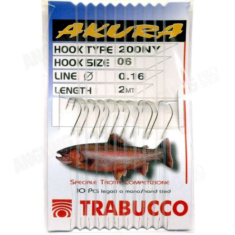 CARLIGE LEGATE TRABUCCO AKURA 200NY Nr.02 10buc/plicCarlige legate cu fir trabucco fabricat in Japonia , speciale pentru pescuitul cleanului,scobarului, mrenei,pastravului, etcCarlig cu microbarbeta, continut inalt de carbon in compozitie, varf ascutit chimic si greutate exrem de redusa.10buc/plicCARLIG NR.02 legat manual cu fir de 0,20mm/lungime fir 2m.