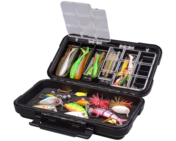 Pe o parte spuma EVA pentru depozitarea usoara de lingurite,voblere,carlige iar in partea cealalta 6 compartimente pentru accesorii mai mici.Ideala pentru un pescar pasionat de spinning.