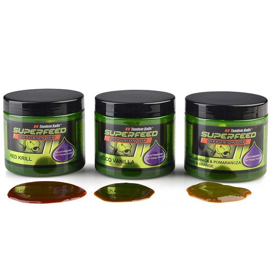 Dip Tandem Baits SuperFeed Diffusion 100ml Sexy PeachSuperFeed Diffusion este un dip lichid foarte concentrat, cu o compozitie vascoasa, ce contine o formula optima de ingrediente nutritve, arome si atractanti. Dip Attract se absoarbe complet in orice tip de nada (boilies, pelete etc) iar odata ajuns in apa raspandeste un "nor" de atractie fluorescent in toate directiile, ce se mentine timp indelungat. Atrage pestii pe patul de nada si induce un raspuns de hranire rapid. Este recomandat sa fie folosit in zone cu agatatura si vegetatie submersa, atat pe rauri cat si pe ape comerciale intens pescuite. Caracteristici: Dip lichid concentratCompozitie vascoasaSe dizolva complet in apaPutere mare de atractieNor fluorescent persistentAmbalaj: 100ml/cutie
