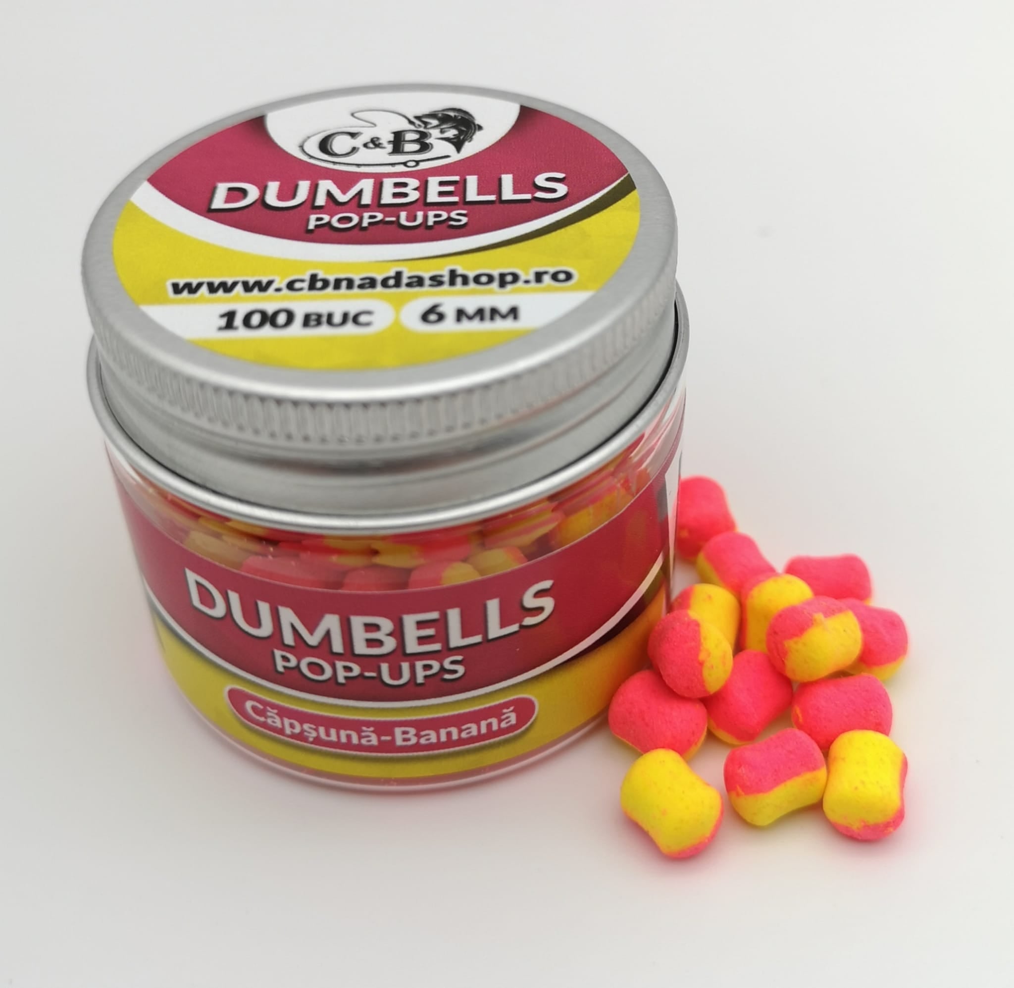 Dumbells C&B Pop-Ups Capsuna Banana 6mmC&B Pop-Ups sunt momeli de carlig, ce se caracterizeaza printr-o capacitate mare de atractie. Mix-ul utilizat la realizarea acestor dumbells are in compozitie cele mai bune ingrediente, ce vor obtine cu siguranta rezultate exceptionale in partidele dumneavoastra de pescuit, indiferent de anotimp.Principalele caracteristici ale acestor momeli sunt culorile fluo, acestea facandu-se extrem de vizibile atunci cand intra in contact cu apa. De asemenea, textura gumata, flotabilitatea sporita si aromele puternice isi regasesc locul printre caracteristicile C&B Pop-Ups.Aceste dumbells-uri pot fi folosite atat pe spin, cat si cu banda elastica.    Flotabilitate ridicata;    Culori Fluo;    Textura gumata;    Diametru: 6mm;    Aroma: Capsuna Banana;    Cantitate: 100 Buc.