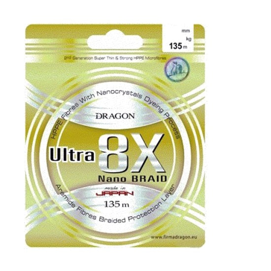 Fir Dragon Ultra 8X Nano 135m Green Fluo 0.06mm / 5.4kg / Green Fluo Fir facut in Japonia de firma Toray International, Inc. CARACTERISTICI: Lungime: 135m Culoare: verde fluo Microfibre foarte subtiri si puternice HPPE, cu fibre Amilan Produs folosind tehnologia 8X Super Tight Weave Technology Perfect rotund in sectiune Rezistenta sporita la nod si in tensiune Ideal pentru orice tip de pescuit Suprafata este matasoasa si ajuta la lanseuri lungi si precise Invizibil in apa Proces de vopsire cu nano-cristale