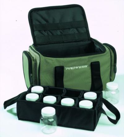 Geanta realizata de PROWESS este ideala pentru orice pescar, are compartimente multiple pentru accesoriile de pescuit.Are 2 buzunare laterale, iar in interior este deja compartimentat astfel:- primul strat cu 8 compartimente cu 8 borcanase din plastic incluse- al doilea strat compartimentat cu 16 locase, pentru diverse accesorii: spray-uri, momeli, flotanti, etc.