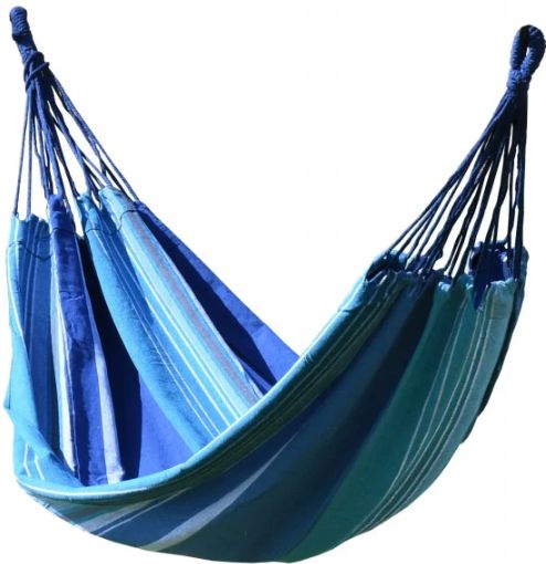 Hamac Cattara Textil, Albastru-Alb, 200x100cmHamac de exterior confectionat din material textil, echipat cu sfoara impletita la ambele capete. Corzile sunt fabricate din fibra moale flexibila. Pachetul nu contine carlige sau funii pentru ancorare. Hamacul poate fi rulat intr-o husa mica, economisind astfel spatiu. Hamacul este confectionat pentru o persoana si are dimensiuni de 100cm in latime, 200cm in lungime si sustine o greutate de 120kg.NOTA: Nu contine carlige sau sfori suplimentare.Tip produs: HamacProducator: CattaraDimensiuni: 200x100cmDimensiuni transport: 18x30x13cmMaterial: textilGreutate sustinuta: 120kgCuloare: Albastru-AlbGreutate: 1.15kg