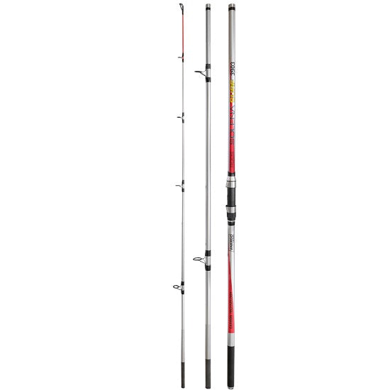 LANSETA ENERGO TEAM SURF 4.20M 3SEG 100-250G/span Lansetele Surf au fost invetate pentru atingerea distanțelor de neatins./span În special se folosesc la pescuitul maritim, de pe țărm, unde țelul este de a lansa cât mai departe, atingerea acelor locuri unde staționează peștii și sunt excluse deja efectele negative ale valurilor./span Varianta adaptată pescuitului peștilor pașnici este ET Solena Surf. (binențeles că o putem folosi și pe mare)/span Dispune de o putere de lansare moderată (100-250g), dar care deja destul de puternică, ca să putem lansa cu ea plumbi de crap la distanțe de peste 100 metri, dar totodată dispune de rezistența necesară pentru driluri, două lucruri care sunt importante într-un pescuit de succes./span Lansetă pentru lansări mari, ce dispune de mâner gol, iar suportul pentru mulinetă se situează la o distanță considerabilă de capătul inferior al lansetei. Astfel putem asigura acea priză necesară pentru lansări la distanță./span Distanța dintre capătul lansetei și dispozitivul de prindere al mulinetei:/span - la varianta de 390: 60 cm/span - la varianta de 420: 60 cm/span - la varianta de 450: 70 cm/span Primul inel dinspre mâner este situat destul de departe de mulinetă, lucru ce ne arată, și faptul că pe primul tronson de lansetă nici nu se găsește inel./span Materialul din care este fabricat este carbon IM8, ce asigură rezistența necesară în timpul lansărilor. Grosimea peretelui, din valorile rezultate în urma măsurătorilor ne indică, că acesta este destul de groasă, astfel că riscul ruperii lansetei în timpul lansărilor forțate să se minimalizeze./span Șirul inelelor SIC asigură alunecarea lină a firului./span În ce privește montura finală, pragul inferior la grosimea firului principal se situează la valoarea de 0,25 mm. Folosirea firului înaintaș este obligatorie!/span Fitingurile sale consolidate sporesc durabilitatea lansetei./span