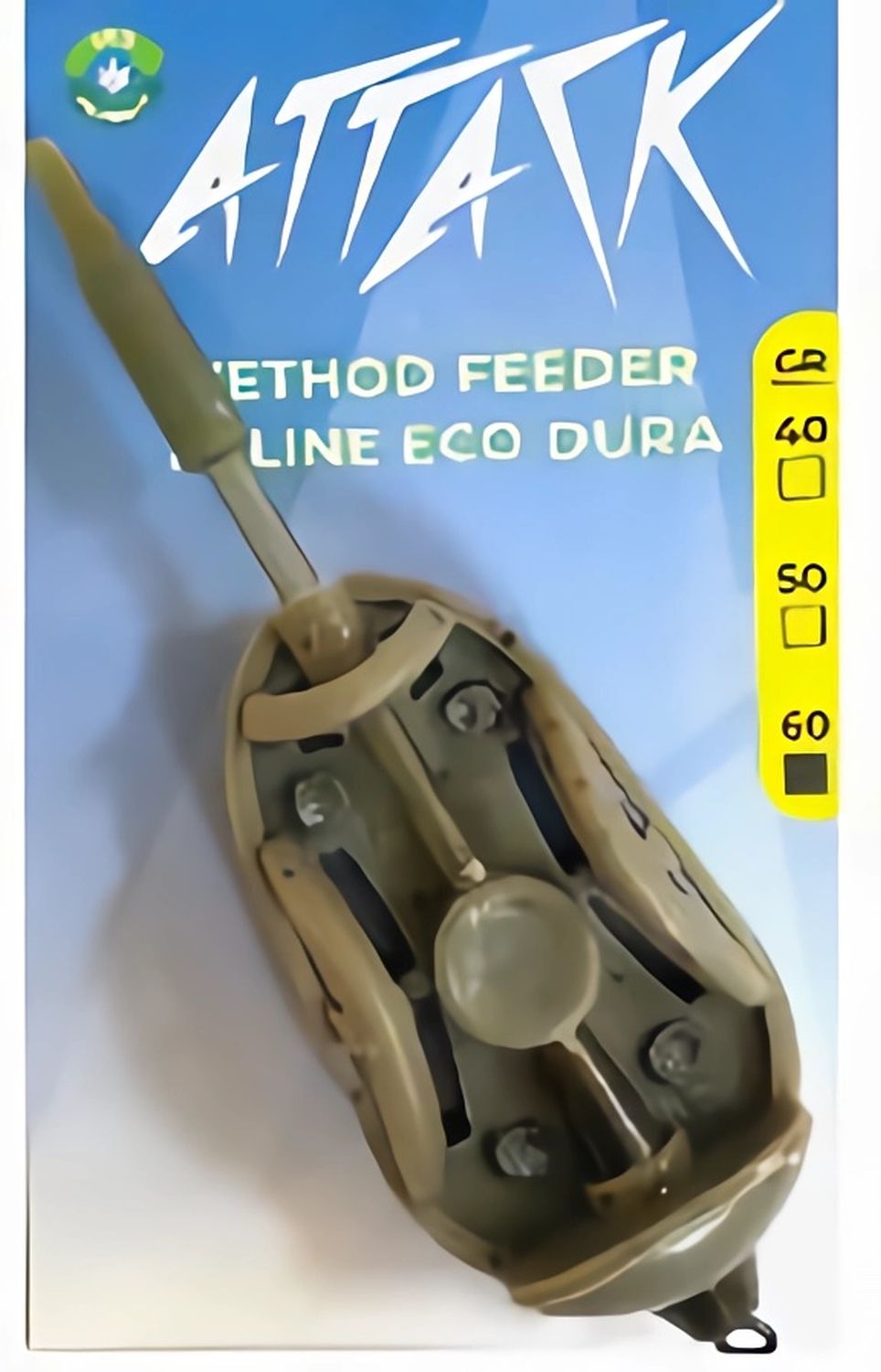 Method Feeder Attack Inline Eco Dura Zinc, 50g, 1buc/pacEco Dura Zinc este cel mai nou model de momitor inline din gama Attack, cu un nou concept si o culoare de camuflaj ce se integreaza perfect in decorul substratului fara a trezi suspiciunea pestilor. Forma aerodinamica asigura lanseuri lungi si precise. Datorita bazei plate, acest tip de cosulet intotdeauna se va aseza corect pe substrat (cu partea superioara incarcata cu nada deasupra) si va oferi o prezentare impecabila a monturii. Pur si simplu asezati o cantitate mica de groundbait sau pelete in matrita de presare rapida corespunzatoare, puneti rigul in mijlocul method feeder-ului si apoi umpleti-l pana atinge partea superioara. Comprimati alimentatorul in momeala, impingeti butonul de eliberare si aveti "galusca" de nada perfect setata.Tip produs: Method FeederProducator: AttackModel: Inline Eco Dura ZincGreutate: 50gTip momitor: inline (culisant)Forma aerodinamicaBaza plata pentru stabilitateIdeal pentru orice tip de nadaCuloare: kakiMod de ambalare: 1buc/pac