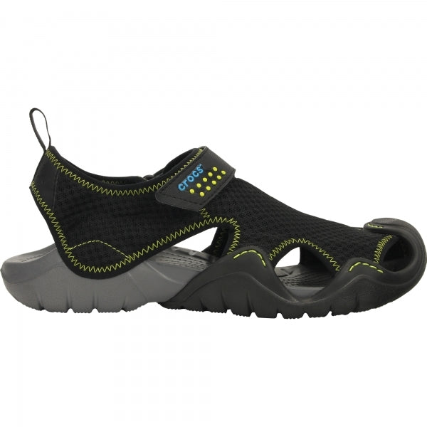 Papuci Crocs Swiftwater Sandal Black/Charcoal Marimea 39,40 M7Papuci Crocs SwiftwaterConstructie integrala din Croslite, materialul foarte usor care raspunde la caldura corpului, se muleaza pe picior si pluteste pe apa. Materialul este o rasina din celule inchise, un copolimer intre acetatul de vinil si etilena. Croslite(TM) este total anti-microbial si nu retine practic nici un miros neplacut. In plus, are proprietati deosebite de absorbtie a socului la impact. Banda care inconjoara talpa este inspirata de tenisii sport clasici, bareta in spate pentru fixare sigura pe picior atunci cand dorim. Orificii pentru aerisire, dar si pentru personalizarea cu Jibbitz.Caracteristici:Porturile de ventilatie, ofera o respirabilitate imbunatatita;Material Croslite™ ce ii fac usori si moi;Talpa ce nu lasa urme, cu o greutate redusa;Bareta din spate se poate muta in fata, transformandu-i in saboti;Sunt usor de spalat;Înălțimea totală a pantofului: 10,5 cmGrosimea tălpii: 3 cmGreutatea pantofului (cea mai mică mărime): 268 g