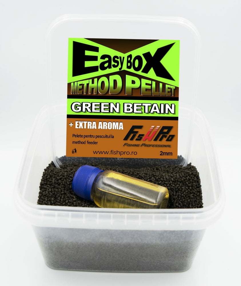 Peletele Easybox Method Pellet - Green Betain sunt concepute pentru a maximiza șansele de captură în timpul sesiunilor de pescuit. Acestea sunt ideale pentru a fi folosite în metoda Method Feeder, fiind ușor de utilizat și oferind rezultate excelente fără necesitatea unor pregătiri prealabile.Cu o aromă puternică de betain verde, aceste pelete atrag rapid peștii și îi mențin în zona de pescuit. Betaina este un aminoacid care are un efect puternic asupra sistemului de orientare al peștilor, conducându-i spre locul unde sunt amplasate peletele și unde este amplasat montura pescuitului.Peletele Easybox Method Pellet - Green Betain sunt durabile și rezistente, menținându-și forma chiar și în condiții de aruncare repetată. Acestea sunt concepute pentru a se dizolva treptat în apă, eliberând în mod constant aromele și atractanții, asigurând un flux constant de atracție pentru pești.Indiferent dacă sunteți un pescar începător sau experimentat, peletele Easybox Method Pellet - Green Betain vă vor ajuta să obțineți rezultate remarcabile în timpul partidelor de pescuit. Cu aroma lor puternică și durabilitatea lor, aceste pelete sunt un instrument esențial în trusa oricărui pescar pasionat.