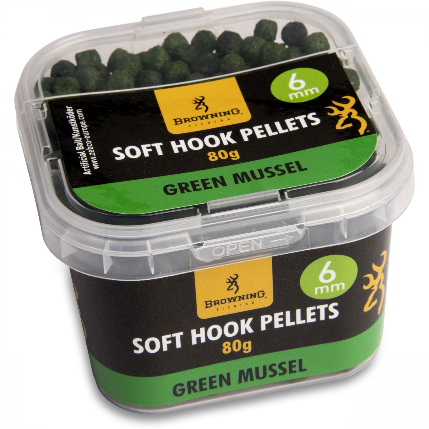 Pelete Soft Browning Soft Hook Pellets 8mm 80g Green Mussel Peletele moi sunt perfect potrivite pentru a fi folosite ca momeală pentru orice fel de pește pasnic. Acest tip de pelete moi pot fi montate atat pe carlig cat si pe fir de par. Au cea mai mare viteză de capturare și sunt foarte ușor de utilizat, disponibile in 6 arome si colori diferite, ambalate in cutii de 80 grame.