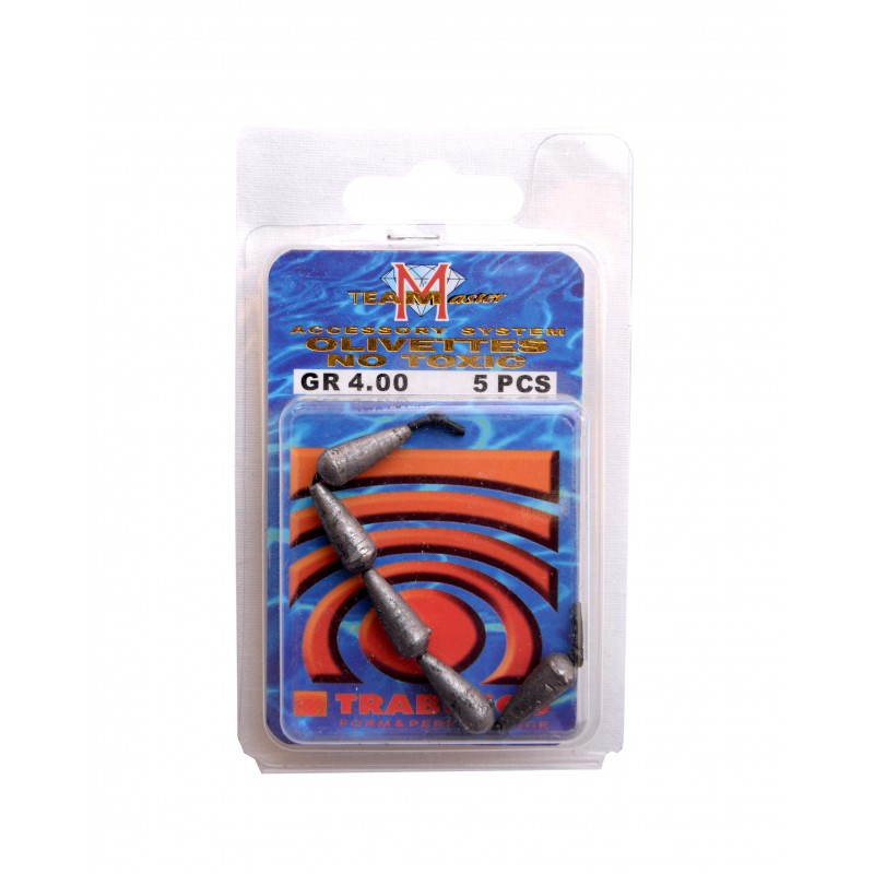 PLUMB TRABUCCO OLIVETA 5 olivete de 4.00gPlumb turnat oliveta Trabucco non toxic, perfect calibrat, fabricat din din plumb pur, dotat cu un tub interior din silicon, pentru o protectie majora a monofilamentului.Blister cu 5 olivete de 4.00g