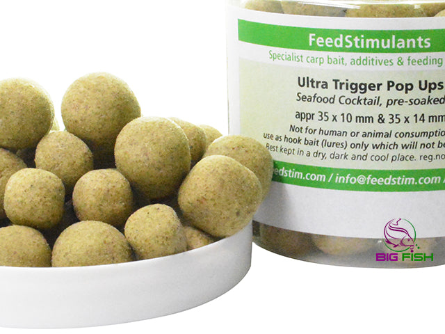 Pop-ups FeedStimulants Ultra Trigger Seafood Cocktail - 16mmAcestea nu sunt niste simple pop-up-uri! Contin doze masive de atractanti naturali, adevarate bombe cu stimuli pentru crapi.Pe langa aditivii din reteta, pop-upurile Ultra Trigger Seafood Cocktail sunt hidratate suplimentar cu lichide de mare atractieAroma finala este de crustacee marine si pesteAditivii inclusi in reteta sunt: extract de scoica cu buza verde (Full Fat Green Lipped Mussel), faina de raci de apa dulce (Extra Fine Crayfish Meal), faina de krill, diferiti indulcitori, arome cu diferiti solventi, palatanti, amestec de uleiuri esentiale, oleorasini, extract de drojdie, aminoacizi. FeedStimulants a introdus in aceste pop-upuri unii dintre cei mai de succes aditivi pe care ii are in ofertaCuloare verde, naturalaDimensiune: 35 x 10mm sau 35 x 14mm in amestec