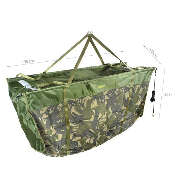 SALTEA CANTARIRE GRIZZLY CAMOU CU PLUTITOR 135X40X80ac Cantarire Grizzly Camou Cu Plutitor este un produs de dimensiuni foarte mari, realizat din materiale de calitate superioară. Este potrivită și pentru depozitarea mai multor crapi mari în același timp. Pernele plutitoare încorporate special mențin părțile laterale ale plasei, protejând astfel peștii de daune. Cablul de fixare are un fir de cupru care poate fi înfășurat în mânerele perforante. Cârligele cântarului pot fi agățate în inelele metalice de pe urechi, ceea ce permite cântărirea în siguranță. Benzi reflectorizante au fost așezate pentru a facilita găsirea pungii in cazul in care este scapata in apa, putand fi depistata chiar și în întuneric. Dimensiune: 135x40x80cm.