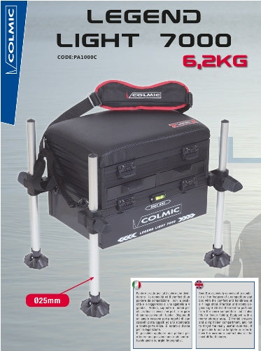 Scaun Colmic Legend Light 7000 - sezut anatomic din imitatie de piele (culoare carbon) - 1 compartiment pentru linii 410mmx290mmx40mm - 2 compartimente frontale 275mmx178mmx40mm - 1 compartiment pentru accesorii 410mmx290mmx120mm - curea pentru transport - diametru picior : 25mm - greutate: 6.2kg