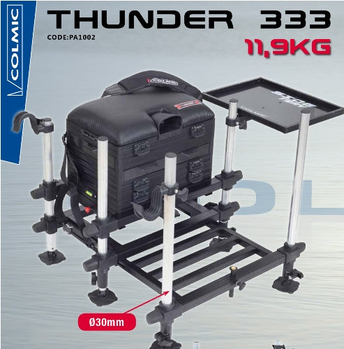 Scaun Colmic Thunder 333 Scaun confortabil cu sezut anatomic si suport pentru rbs. - 3 compartimente pentru monturi: 410mmx290mm h.40mm - 1 sertar lateral: 262mmx395mm h.40mm - 2 sertare frontale: 178mmx275mm h.40mm - spatiu pentru accesorii: 410mmx290mm h.200mm - picioare spate: h.550mm Ř30mm - picioare fata telescopice: h.550mm Ř30mm - tava laterala: 410mmx320mm