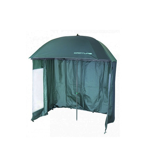 Umbrela Energo Team cu Paravan JAF Evolution 210T 220cm/spanUmbrela prevazuta cu umbrar, ideala pentru partidele de pescuit in zilele toride de vara sau pe timp de ploaie. Se monteaza si se strange usor intr-un timp foarte scurt. Stalpul de sustinere central dispune de sistem de inclinare a umbrelei sub diferite unghiuri, iar spitele sunt ranforsate pentru rezistenta sporita in caz de vant puternic./span Materialul din care este confectionata umbrela este dublu stratificat, iar cusaturile sunt sudate pentru a oferi acesteia impermeabilitate totala. Umbrela mai beneficiaza de geamuri laterale si de fermoar, ambele impermeabile. Umbrarul este fix (cusut) si poate fi ancorat in pamant. Umbrela vine insotita de o husa de transport./span Caracteristici:/strongCadru de otel;/spanMaterial: Nylon 210T, impermeabil 100%/spanDiametru: 220cm (latime reala mai mica)/spanInvelis dublu/spanGeamuri laterale impermeabile/spanSpite ranforsate/spanCusaturi sudate/spanUsor de montat/spanFermoar impermeabil/spanHusa de transport: Da/span